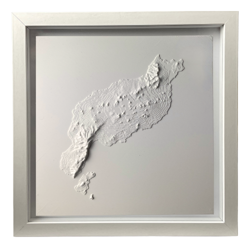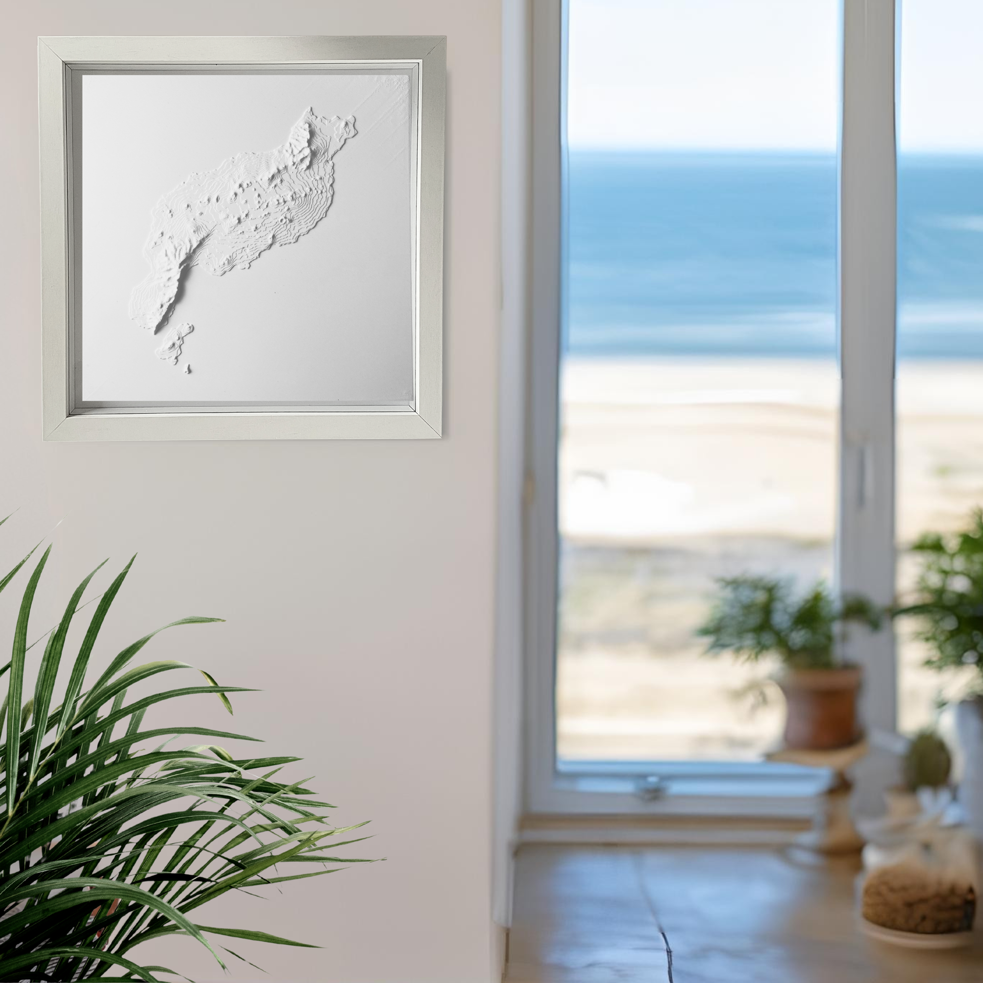 🔲 3D-Bild: Unsere Produkte bestehen aus 100 % biologisch abbaubarem Kunststoff auf Basis von natürlicher Maisstärke. Sie sind UV-beständig, leicht zu reinigen (z. B. mit einem Föhn) und haben eine matte, gipsähnliche Oberfläche. Das Bild besteht aus einem Massivholzrahmen. Für eine einfache Wandmontage liegt eine Holzhalterung mit Holzstruktur bei.