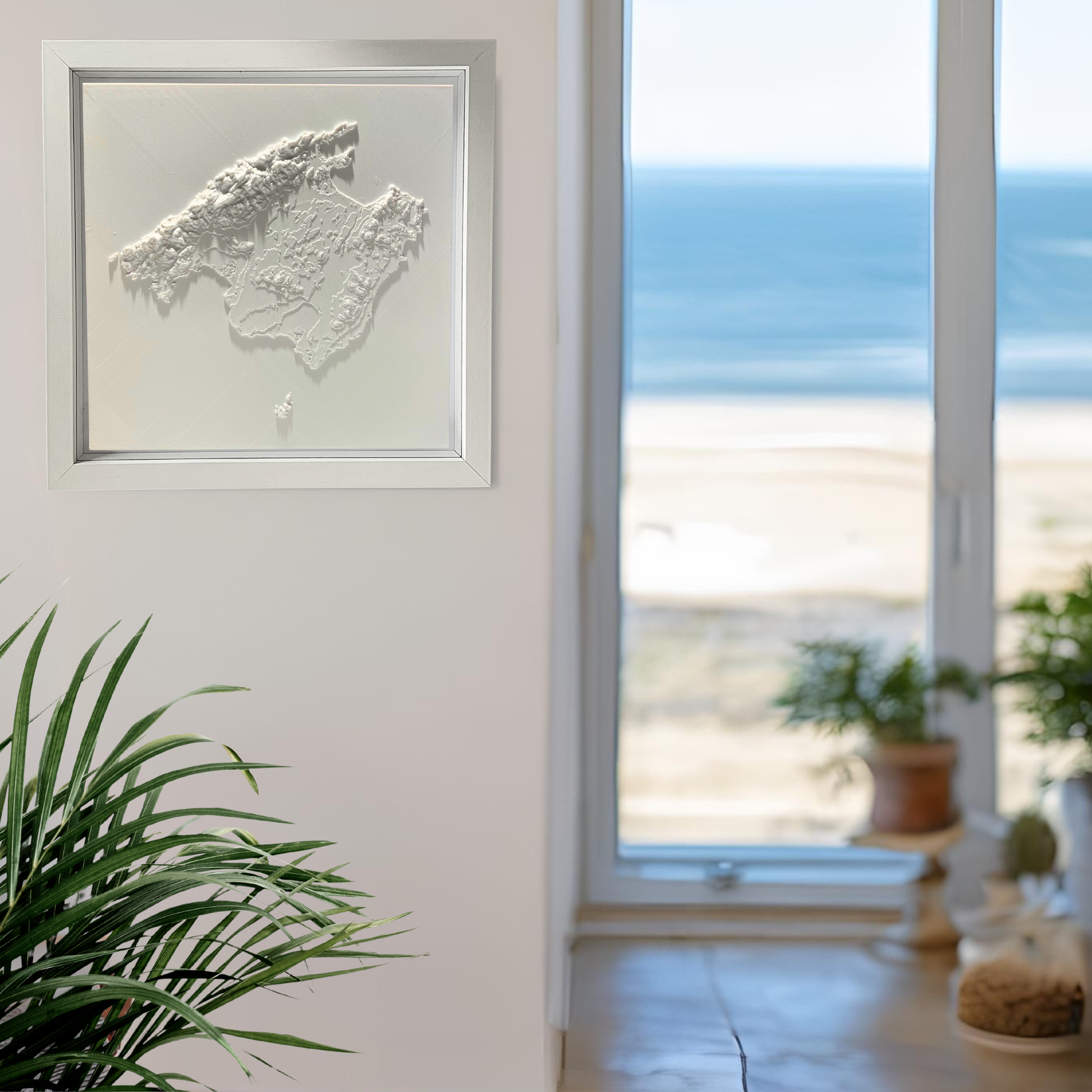 🔲 3D-Bild: Unsere Produkte bestehen aus 100 % biologisch abbaubarem Kunststoff auf Basis von natürlicher Maisstärke. Sie sind UV-beständig, leicht zu reinigen (z. B. mit einem Föhn) und haben eine matte, gipsähnliche Oberfläche. Das Bild besteht aus einem Massivholzrahmen. Für eine einfache Wandmontage liegt eine Holzhalterung mit Holzstruktur bei.