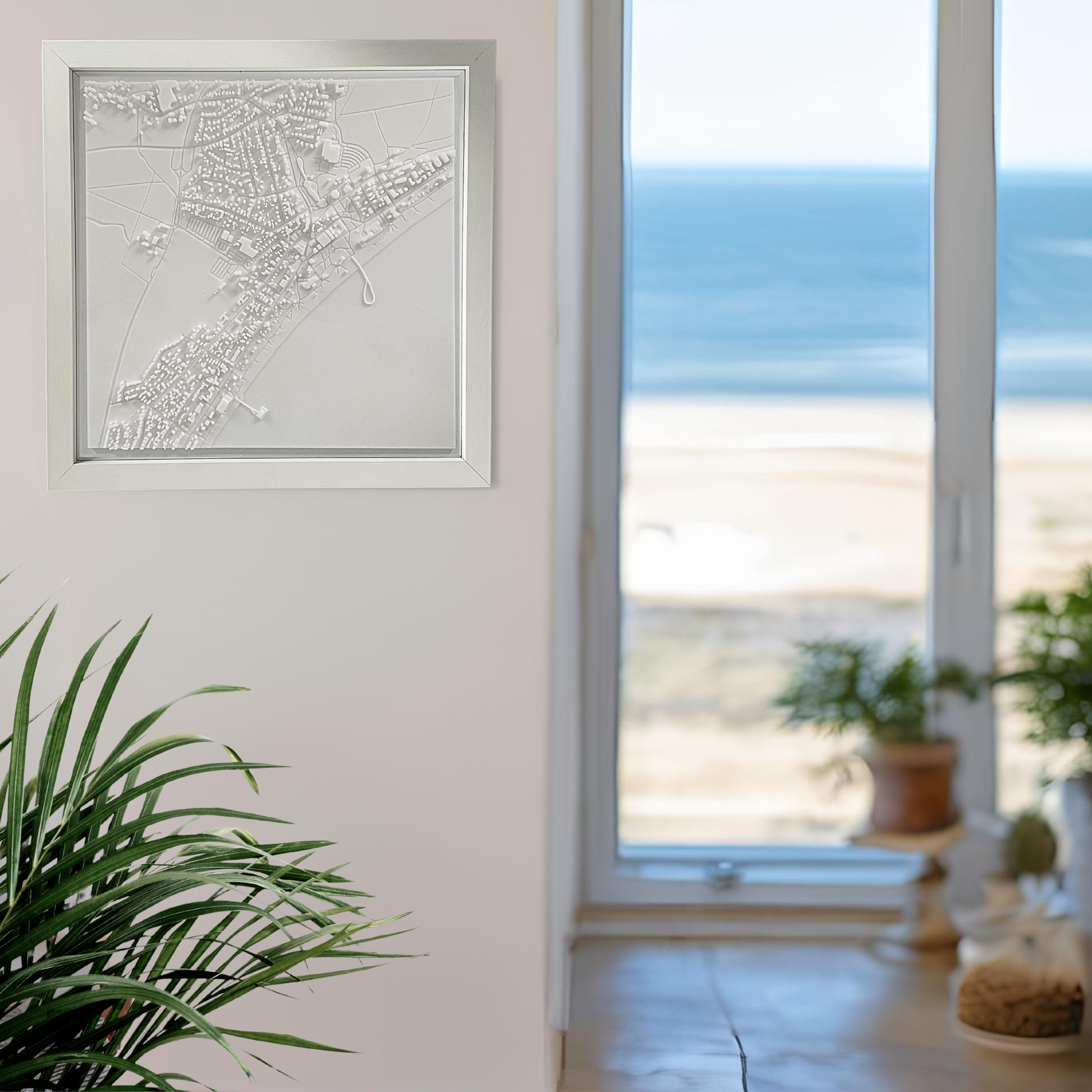 🔲 3D-Bild: Unsere Produkte bestehen aus 100 % biologisch abbaubarem Kunststoff auf Basis von natürlicher Maisstärke. Sie sind UV-beständig, leicht zu reinigen (z. B. mit einem Föhn) und haben eine matte, gipsähnliche Oberfläche. Das Bild besteht aus einem Massivholzrahmen. Für eine einfache Wandmontage liegt eine Holzhalterung mit Holzstruktur bei.