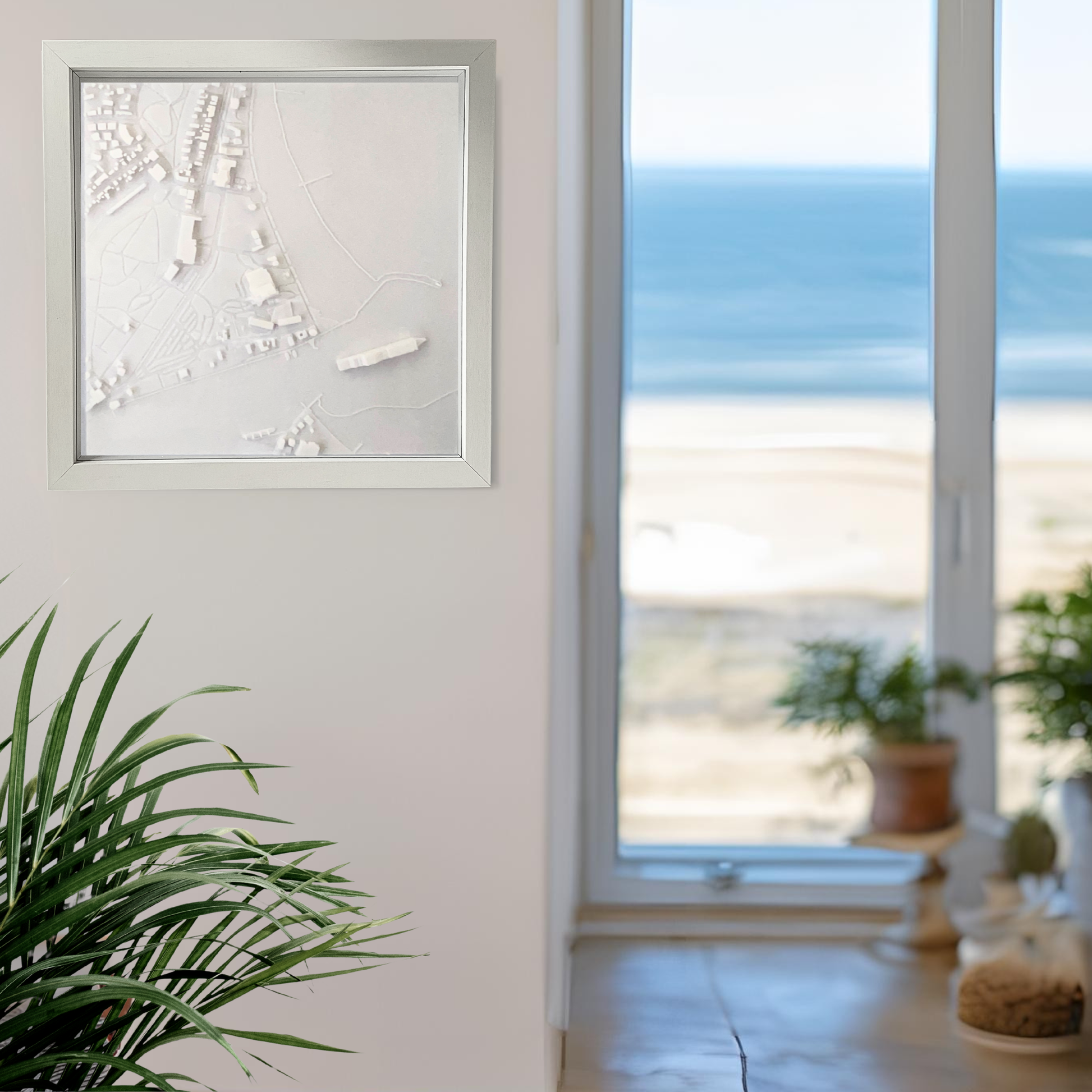 🔲 3D-Bild: Unsere Produkte bestehen aus 100 % biologisch abbaubarem Kunststoff auf Basis von natürlicher Maisstärke. Sie sind UV-beständig, leicht zu reinigen (z. B. mit einem Föhn) und haben eine matte, gipsähnliche Oberfläche. Das Bild besteht aus einem Massivholzrahmen. Für eine einfache Wandmontage liegt eine Holzhalterung mit Holzstruktur bei.